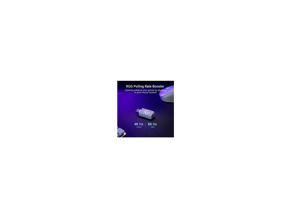 - ROG Polling Rate Booster: Pripojte prijímač myši priamo k zariadeniu a zvýšte rýchlosť dotazovania až 4000 Hz v bezdrôtovom režime a až 8000 Hz v drôtovom režime.