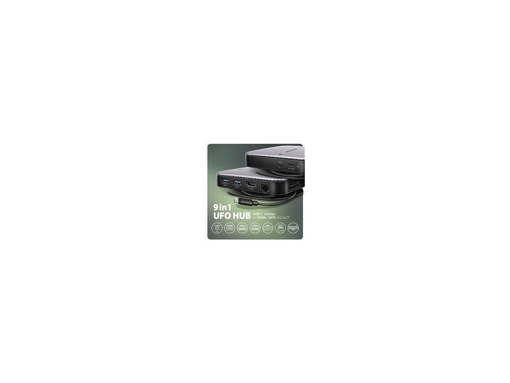 AXAGON HMC-UFO USB-C 10Gbps UFO hub rozšíri váš notebook, počítač alebo tablet o osem portov a externý box pre M.2 disk. Pripojte svoj notebook k dokovacej stanici 9v1 pomocou kábla USB-C s dĺžkou 65 cm. V okamihu máte k dispozícii integrovaný slot pre disk NVMe alebo SATA M.2, čítačku kariet SD a microSD a konektory na pripojenie monitora, zariadenia USB, slúchadiel, sieťového kábla a napájania Power Delivery. Kompatibilita s Thunderbolt 3/4 vám tiež poskytuje jednoduchú a kompaktnú dokovaciu stanicu pre notebooky, ako je Apple MacBook Air alebo Pro.