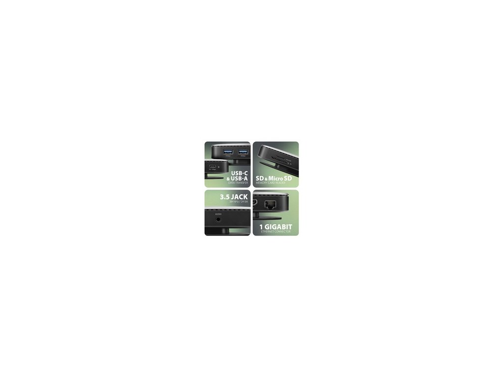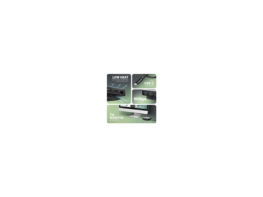 Dva výstupy USB-A 10 Gb/s umožňujú pripojenie externých diskov, flash diskov, myši, tlačiarní a ďalšieho príslušenstva USB. USB porty nabíjajú aj mobilné telefóny a tablety s výkonom až 7,5 W. Hub je tiež vybavený kombinovaným USB-C portom, ktorý je možné využiť na prenos dát (USB 5Gbps) alebo na nabíjanie notebooku pomocou nabíjačky Power Delivery. Pomocou vhodnej PD nabíjačky môžete napájať nielen notebook, ale aj samotný hub, s výkonom až 100W vďaka technológii Power Delivery 3.0.