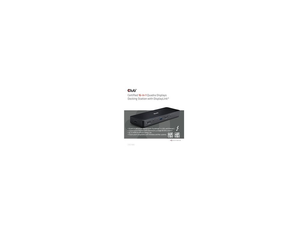 Club 3D CSV-1583 je dokovacia stanica Quadra Displays 16 v 1 s certifikáciou Thunderbolt 4 a DisplayLink, ktorá poskytuje najpokročilejšie, najúčinnejšie a najvšestrannejšie dostupné I/O riešenie s rýchlosťou až 40 Gb/s pre dáta a video. Zo všetkých 7 video portov umožňuje výstup max. 3 videí pri pripájaní k M1, M2 a M3; 4 videá pri pripájaní k M1 Pro/Max, M2 Pro/Max, M3 Pro/Max a ďalším notebookom radu Mac a notebookom Windows.