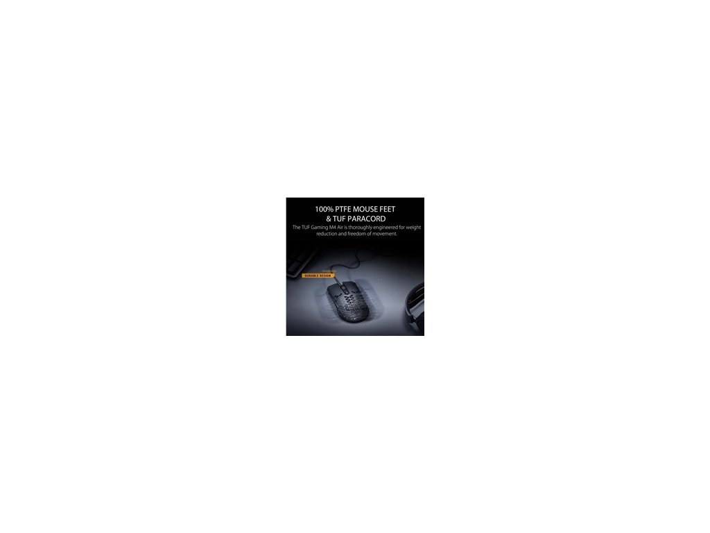 Ľahká drôtová herná myš so snímačom s rozlíšením 16 000 dpi, šiestimi programovateľnými tlačidlami, ultraľahkým plášťom Air Shell, odolnosťou voči vode IPX6, antibakteriálnou ochranou ASUS, šnúrkou TUF Gaming Paracord a čistými PTFE nožičkami